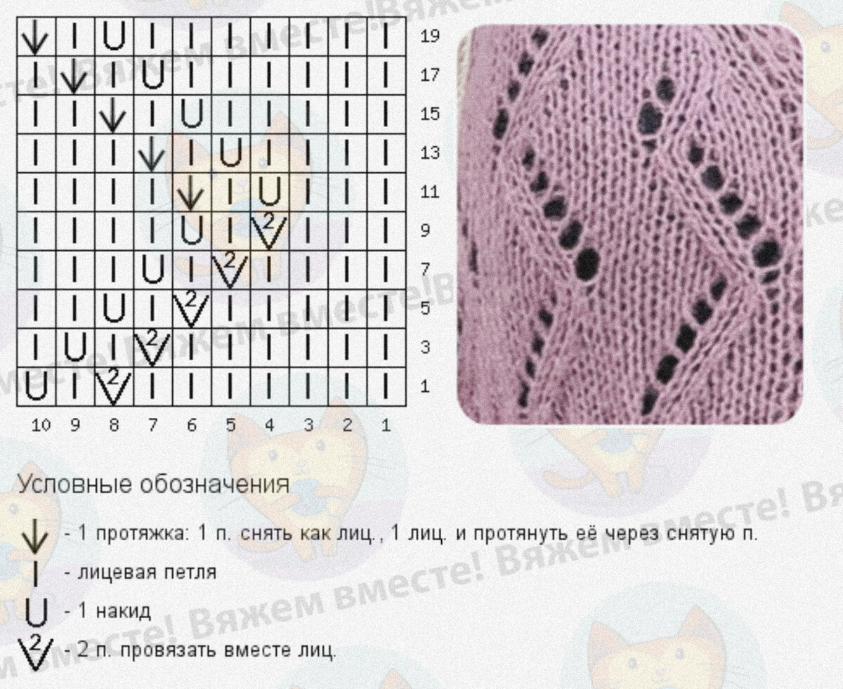 Ажурный узор с зигзагами, которым вяжется модель выполняется по схеме ниже. На ней обозначен один раппорт (10 петель и 20 рядов). Четные ряды схемы вяжутся так, как лежат петли на спице, накиды изнаночными при поворотном вязании и лицевыми при вязании по кругу.