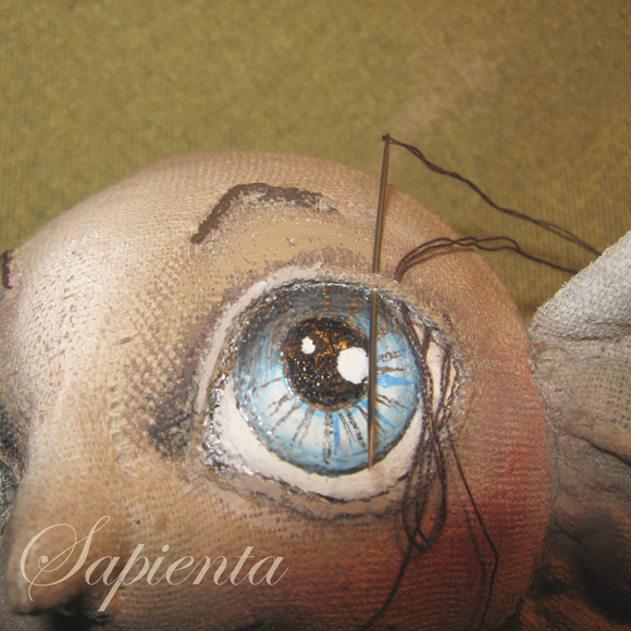 Не доходя до уголка глаза делаю маленькую закрепку на веком, нитку аккуратно обрезаю. По такой же схеме, прошиваю петлями второе веко. После окончания, петли разрезаю и выравниваю ножницами, ровно подрезая будущие ресницы.