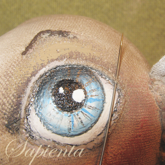 Зрачок прорисовываю черным акрилом, можно нанести сверху небольшой блик размытый по краям. Можно и не наносить, все зависит от вашего желания и зрительного восприятия. Я бы рекомендовала почаще смотреть на свою работу как-бы стороны, это помогает правильно распределять цветовые оттенка и тени. И главное нельзя торопиться. Роспись лица это один из важнейших этапов, чтобы ваш персонаж "ожил".
