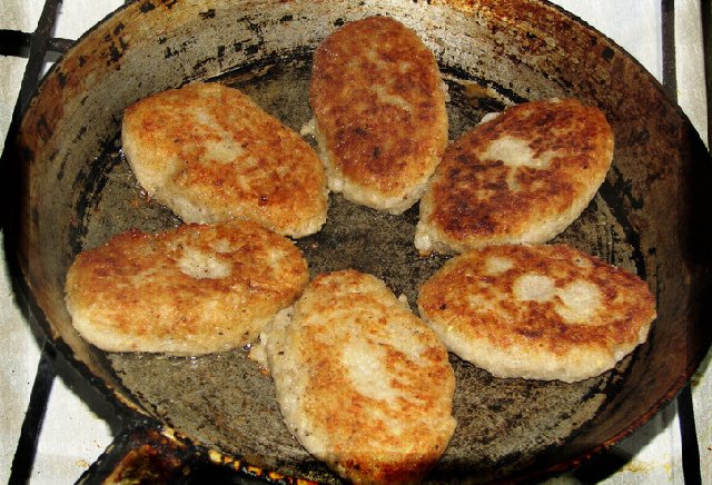 Формируем котлетки, панируем в муке и обжариваем до золотистой корочки.