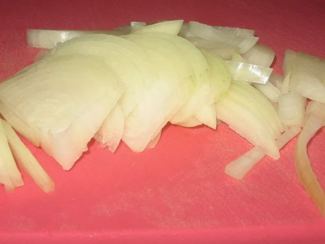 Лук режем крупно, полукольцами.