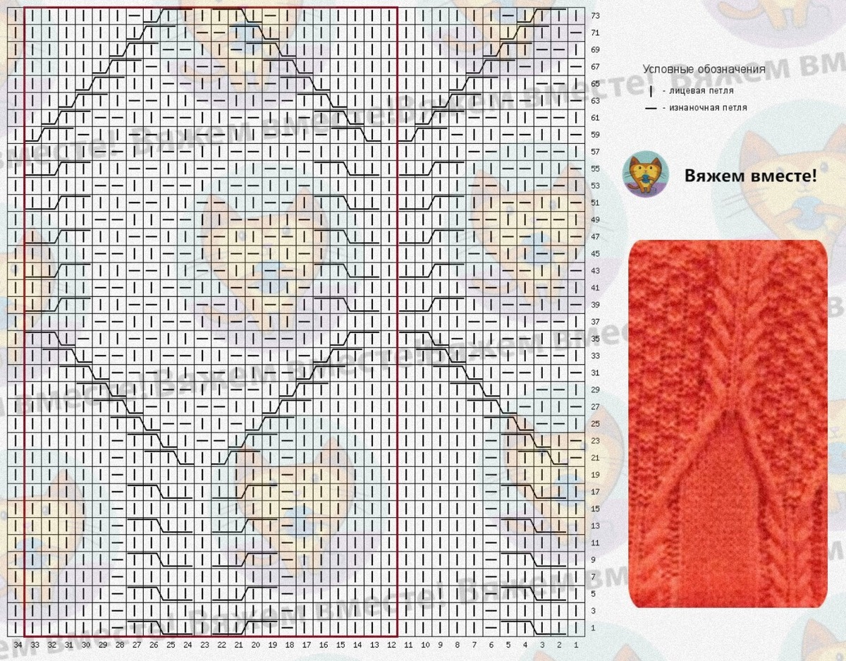 Учтите, что на схеме даны только лицевые ряды вязания, в чётных рядах петли провязываются так, как они лежат на спице.