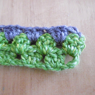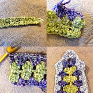 ROW 6: LEFT SIDE: Join as you go using a sl st, between each gs, att 5th col. ch2, 2dc in first st, [flat end], 3dc in next 10sp, 3dc, ch2, 3dc in next corner sp, 3dc in next 3sp, 4tr in last sp
