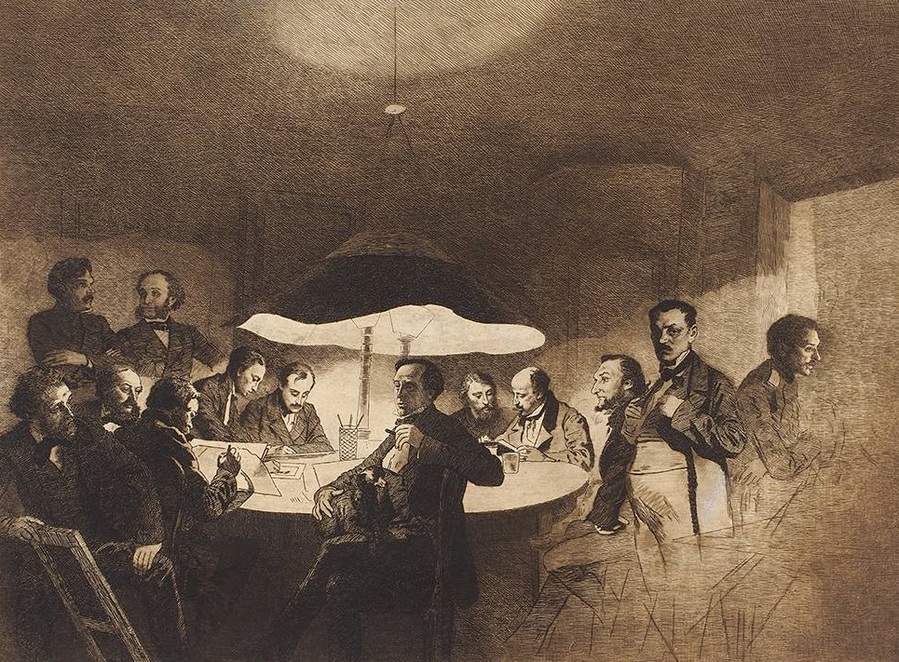 Бобров Виктор Алексеевич (1842—1918) по рисунку Зичи Михаила Александровича (1827—1906) «Собрание общества рисовальщиков». 1906. (Бумага на картоне, офорт)