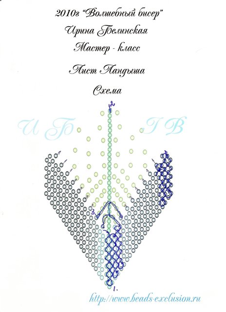 Когда сам листок будет готов, соединяем его основание, и проходим к центру... см схему, набирая бисеринки, делая центральную прожилку. Возвращаемся по ней туда-обратно, и начинаем заплетать листок. См. схему.