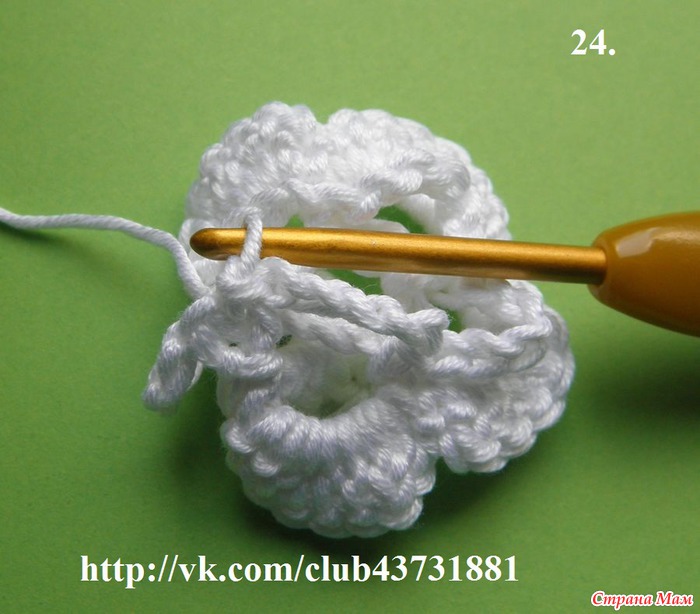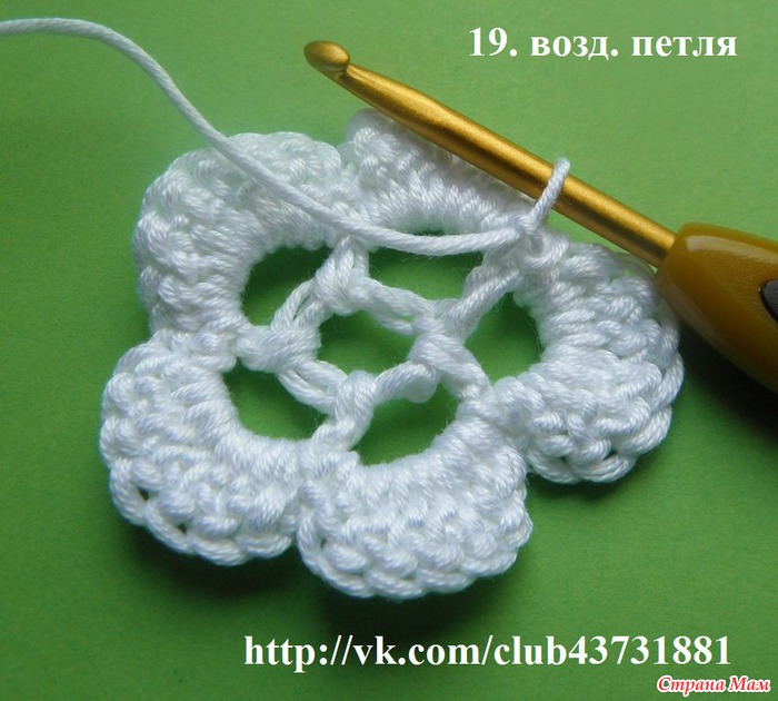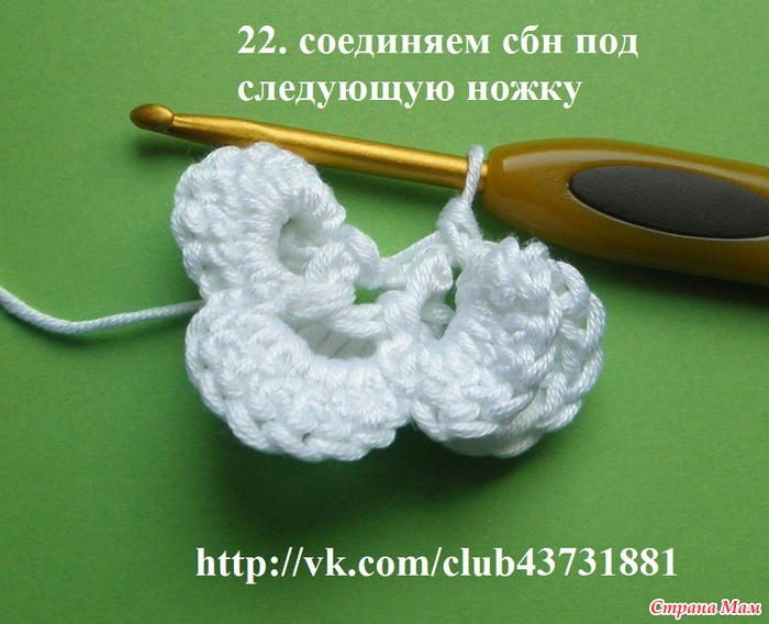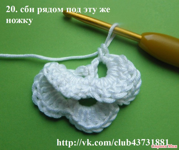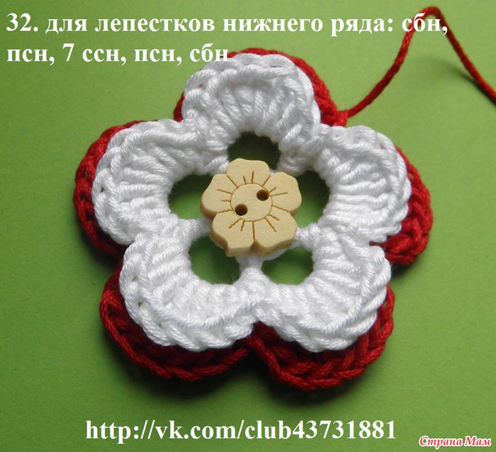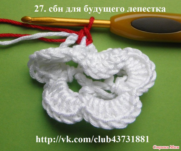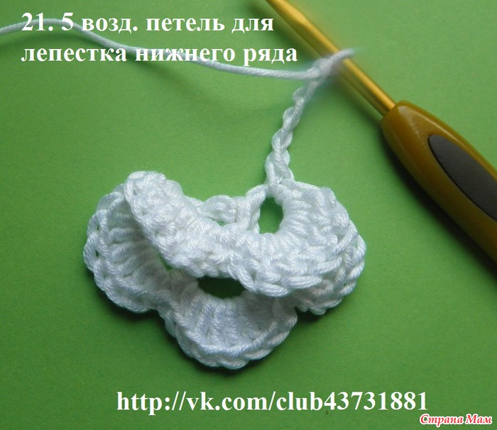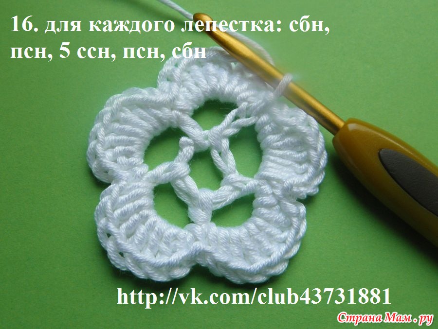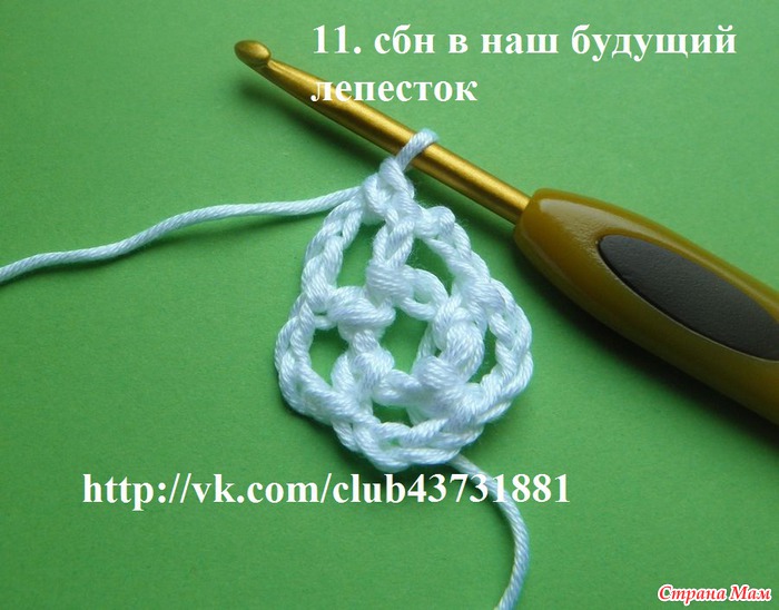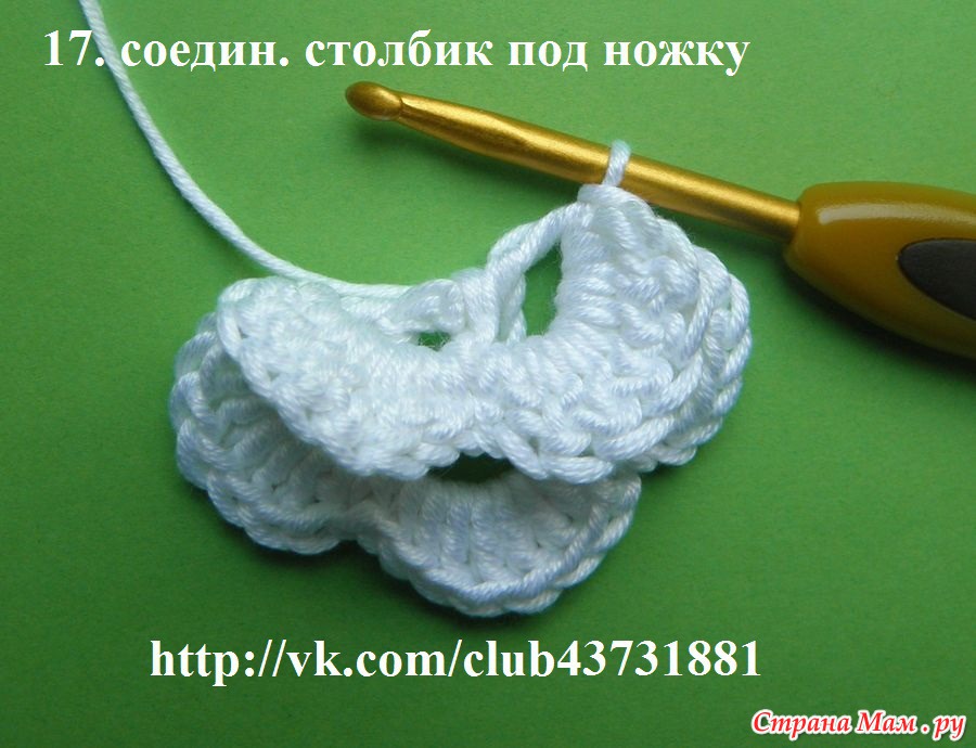 [показать] Так вот, вяжете соедин. столбик под ножку, потом возд. петля и дальше сбн (все есть дальше на фотках). А потом вяжете нижний ряд для лепестков. Тогда у вас в месте соединения будет так, как между остальных лепестков и цветок будет выглядеть очень аккуратно.