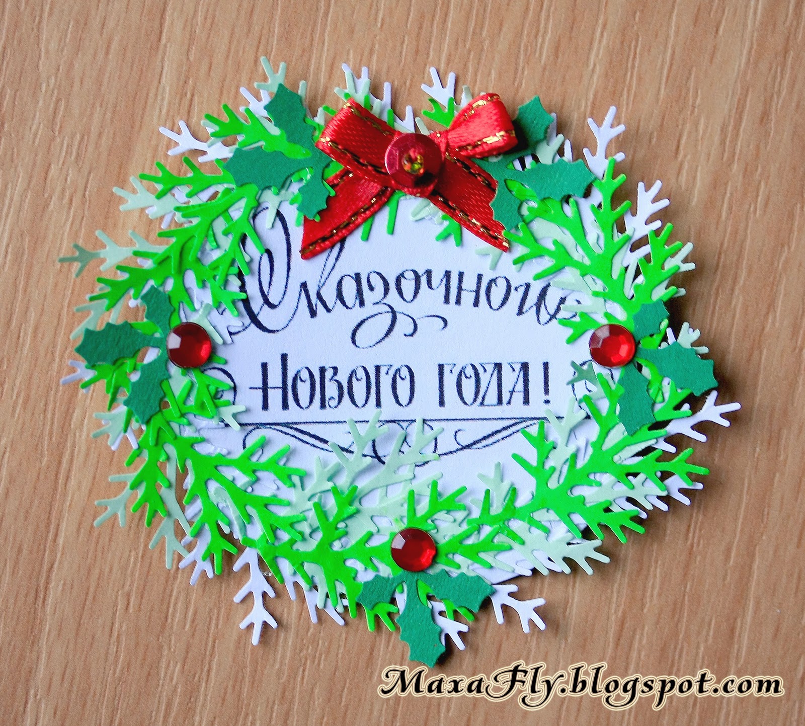 Следующий слой был светло-зеленого цвета, а третий слой - более яркого зеленого цвета. Веночек я украсила веточками остролиста, красными стразами и бантиком.
