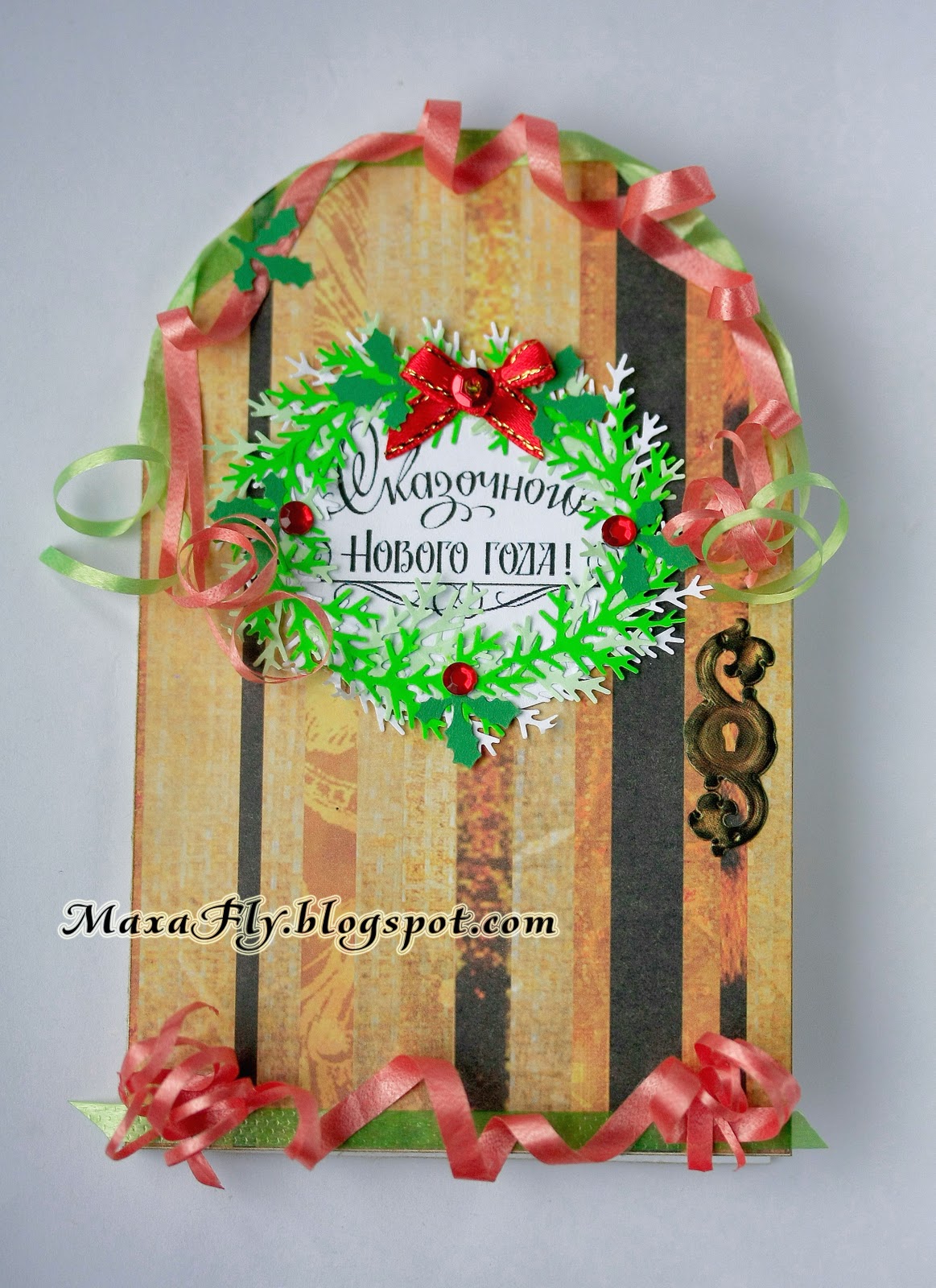 На заготовку приклеила веночек, замочек и по краю закрутила серпантин - сначала зеленый, а потом красный. Кстати, между собой серпантин очень плохо склеивается, а на скотче держится прекрасно.