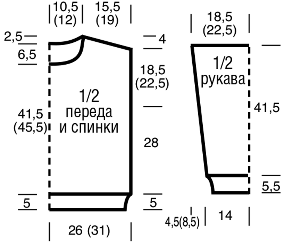 Вязать, как спинку, но для более глубокой горловины закрыть средние 21 (27) п. через 41, 5 cм = 102 р. (45,5 cм = 112 р.) от резинки и обе стороны закончить раздельно.