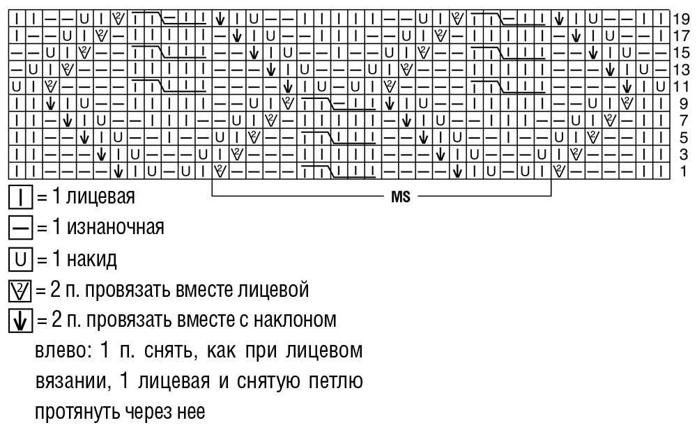 Количество петель кратно 20 + 19 п. Вязать по приведенной схеме. На схеме даны только лицевые ряды. В изнаночных рядах петли провязывать по рисунку, накиды – лицевыми. В ширину начинать с петель перед раппортом, повторять раппорт, заканчивать петлями после раппорта. В высоту повторять с 1-го по 20-й ряд.