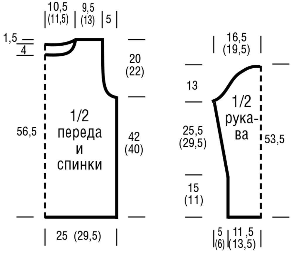 Через 40,5 см = 110 рядов от начального ряда закрыть для оката рукава с обеих сторон 1 x 3 п., затем в каждом 2-м ряду для 1-го размера закрыть * 1 x 2 п. и 1 x 1 п., от * повторить еще 7 раз; для 2-го размера закрыть 16 x 2 п. Оставшиеся 16 (14) п. закрыть через 53,5 см = 144 ряда от начального ряда.