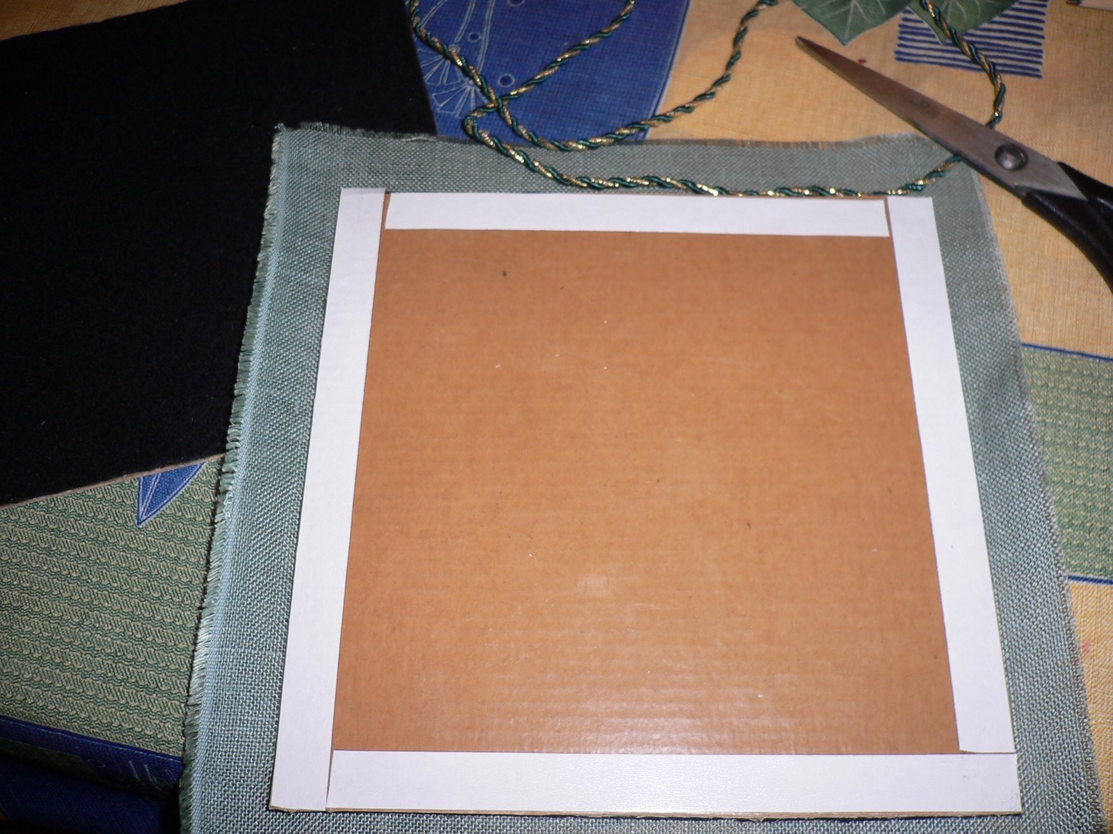 Затем аккуратненько закрываем двусторонним скотчем одну сторону картонной заготовки. Туда мы приклеим прокладку для придания мягкости картиночке. В моем случае это драп. Можно использовать синтепон, фетр и т.д. и т.п.