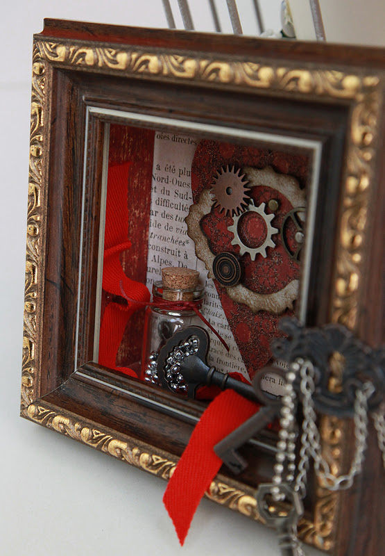 Сердце в центре украшено горячим эмбоссингом, я использовала Штемпельная подушечка Tim Holtz Distress на водной основе, цвет ореховая патина, Ranger и пудру "Винтажная ржавчина" все металлические детали и украшения от Тима Хольца, рамочка - вырубка чибборд, бутылочка от ТХ в нее насыпаны металлические винтажные бусины и в них лежит металлическое винтажное сердечко