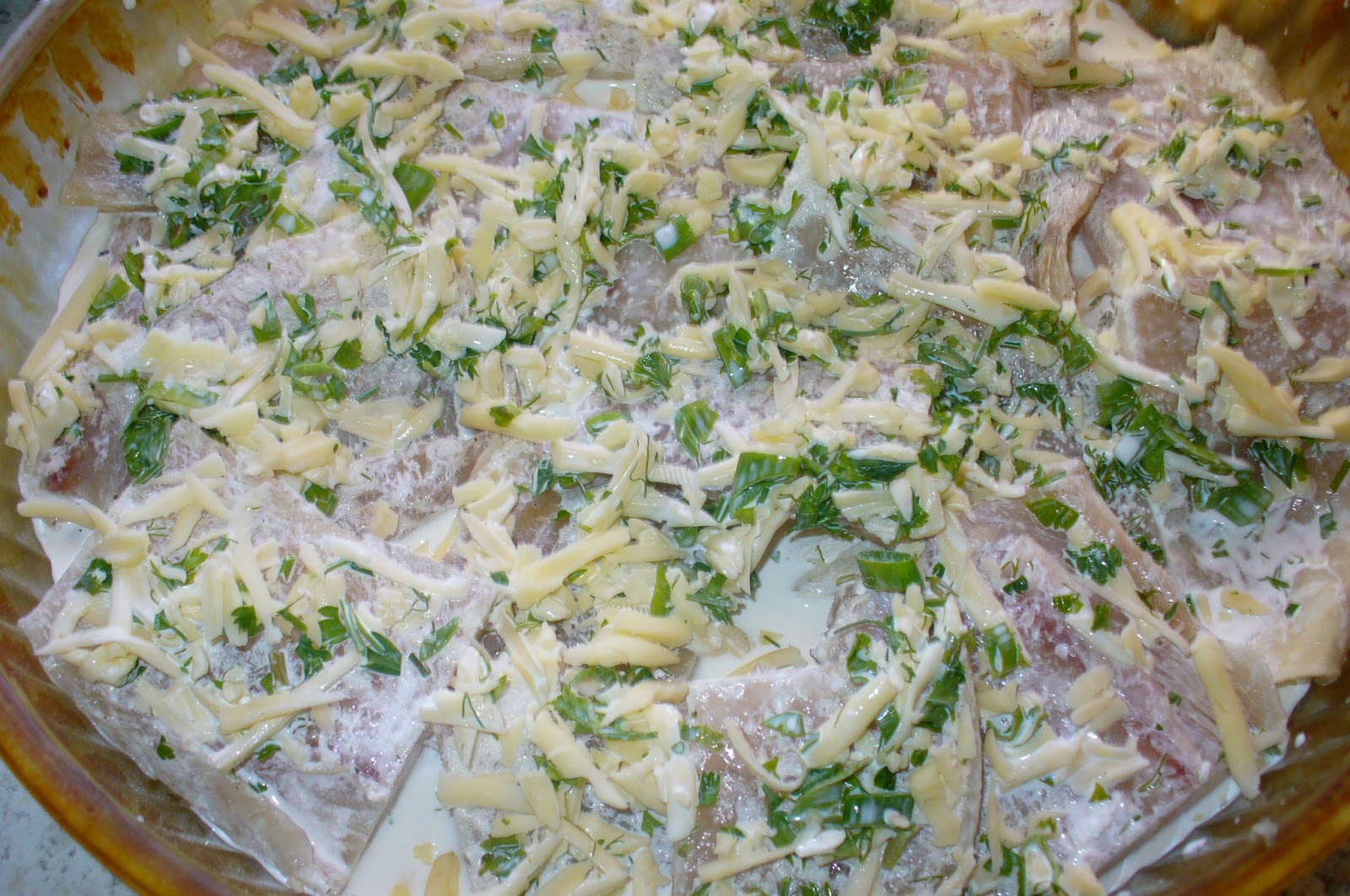 Посолите, поперчите и уложите в форму для запекания. Подготовьте соус для нашего рыбного филе – натрите сыр, смешайте его со сливками и рубленой зеленью.