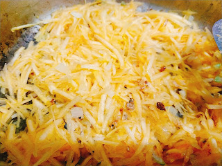 На этой же сковороде, подлив маслица, обжариваем луковицу, нашинкованную мелким кубиком. Через минуту добавляем натёртую тыкву.