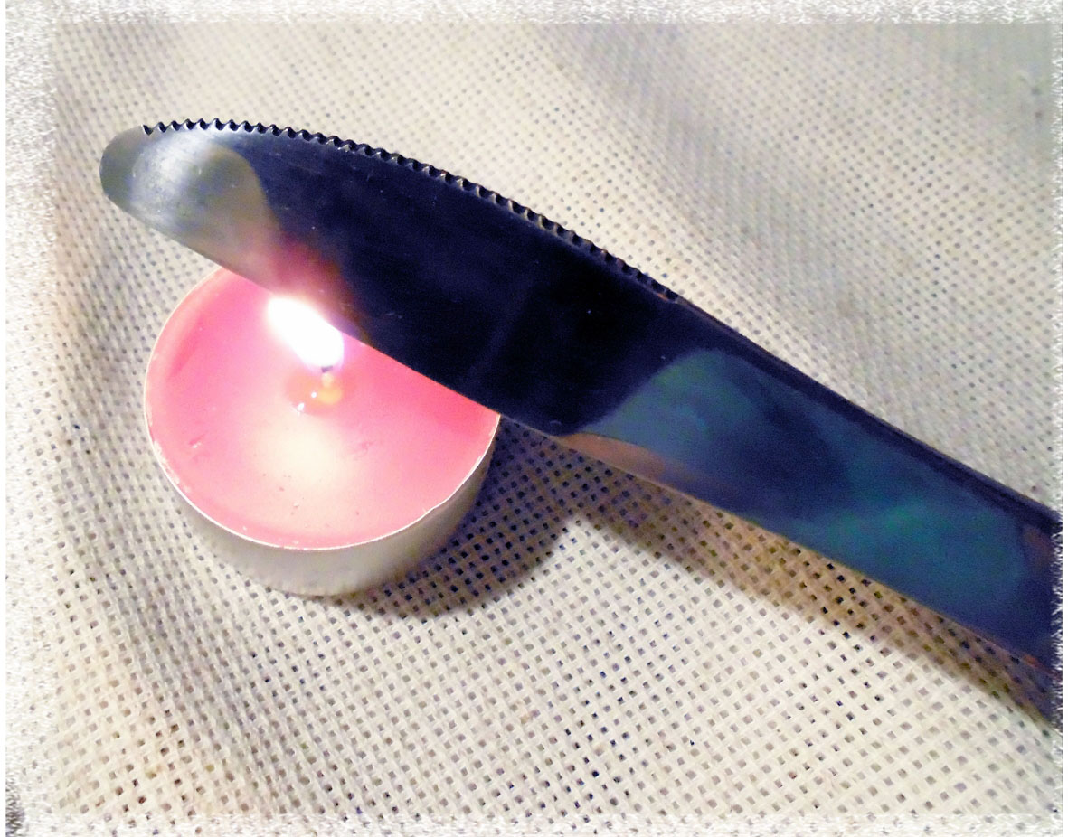 Не пользуйтесь зазубренной частью ножа, только ровной стороной!