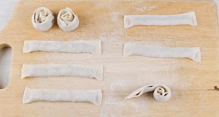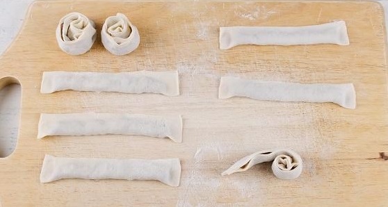 4. Сверните полоску пополам и слегка приплюсните ее. Скрутите подготовленные полоски рулетиком, защипнув конец, чтобы в процессе варки рулетик у нас не развернулся.