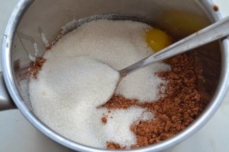 6. Пока пеклись коржи, я сразу же занялась кремом, в ковше смешать сахар, яйцо и какао, растереть.