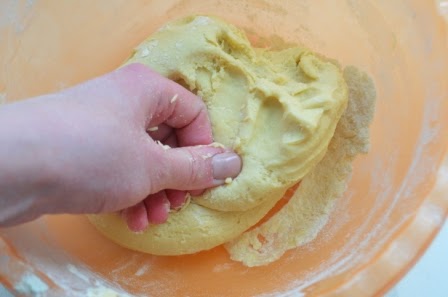 2. Добавить сметану, муку и разрыхлитель и вымешать тесто. По необходимости еще добавить муки, чтобы тесто было нелипким и гладким. Я вымешивала прямо в миске.
