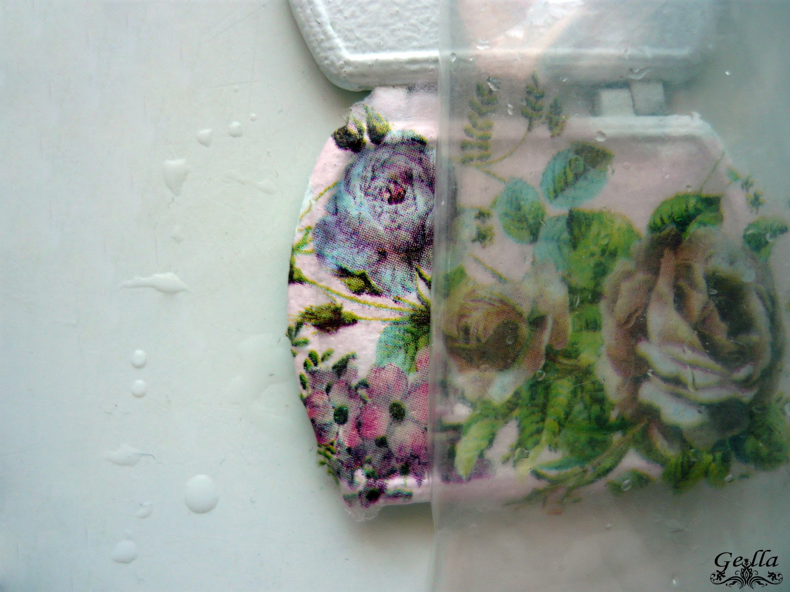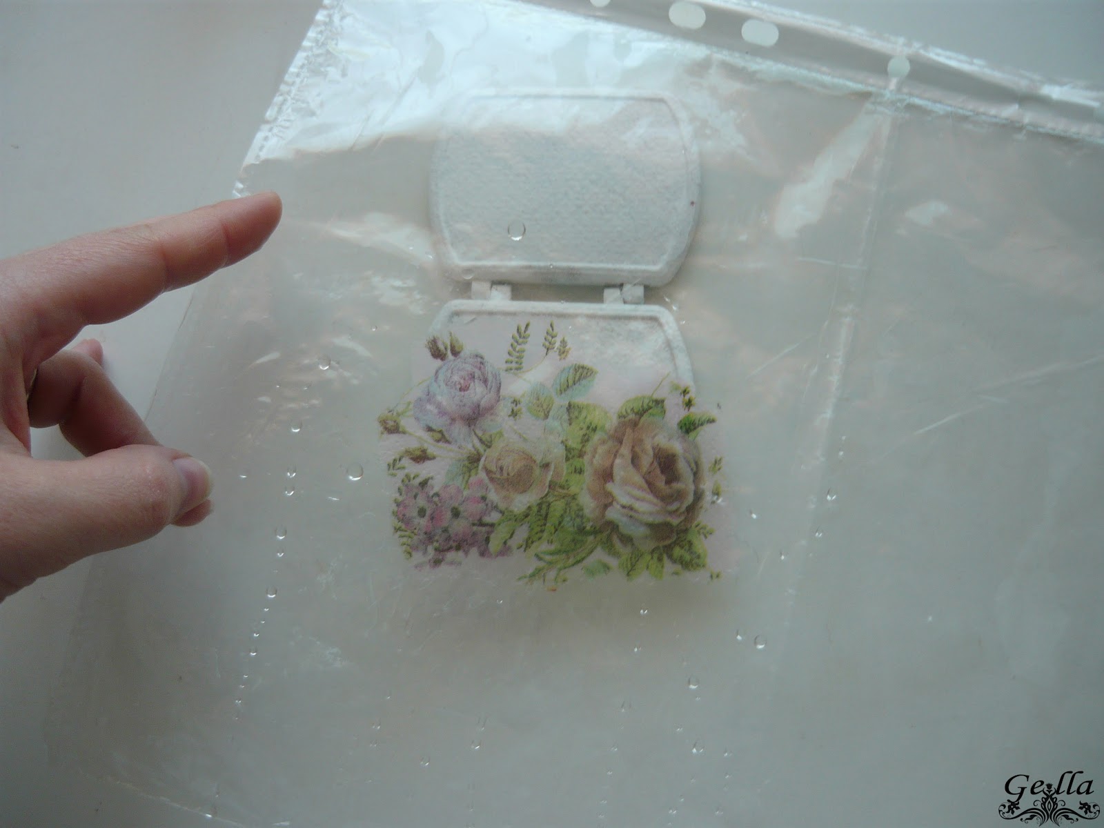 Кладём мотив лицевой стороной вниз на файлик и аккуратно, с руки, наливаем на него воды столько, чтобы мотив плавал на файлике. Под кран лучше не совать - может помять салфетку. Можно это делать из пульверизатора - получится ровнее и меньше пузырей. Далее быстро, лёгкими касаниями пальцев выгоняем пузыри воздуха из-под салфетки.