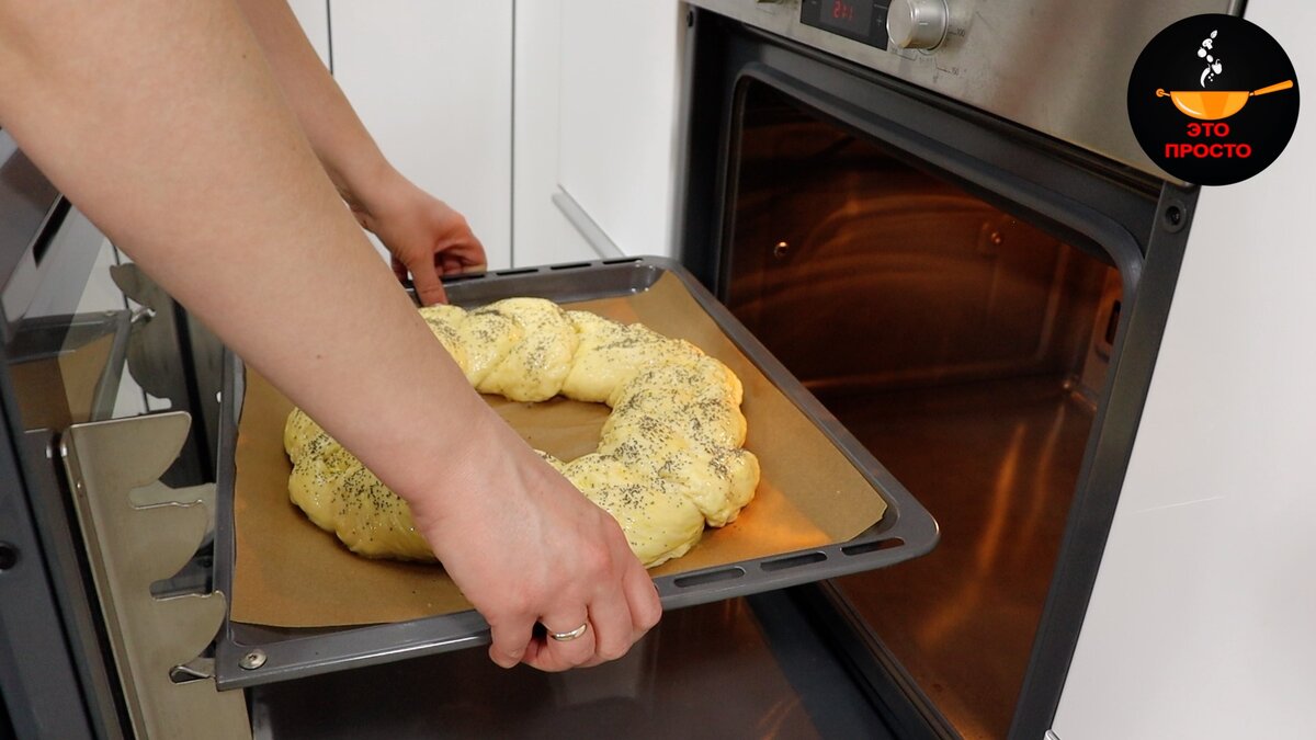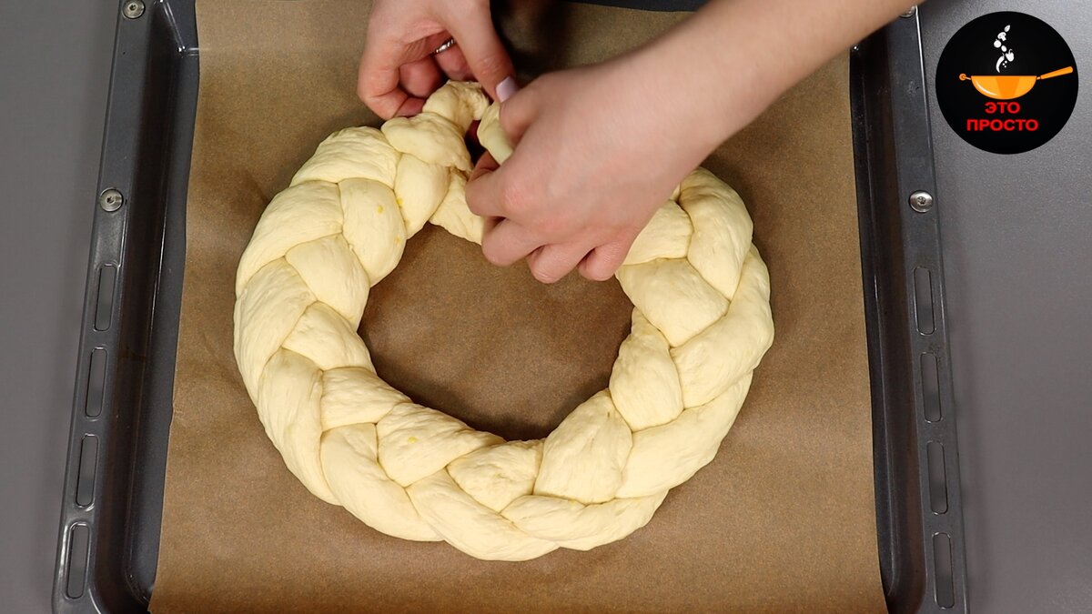 Переносим заготовку на противень, застеленный бумагой для выпечки, соединяем 2 края пирога вместе, накрываем пакетом и полотенцем и оставляем на 20 минут на расстойку.