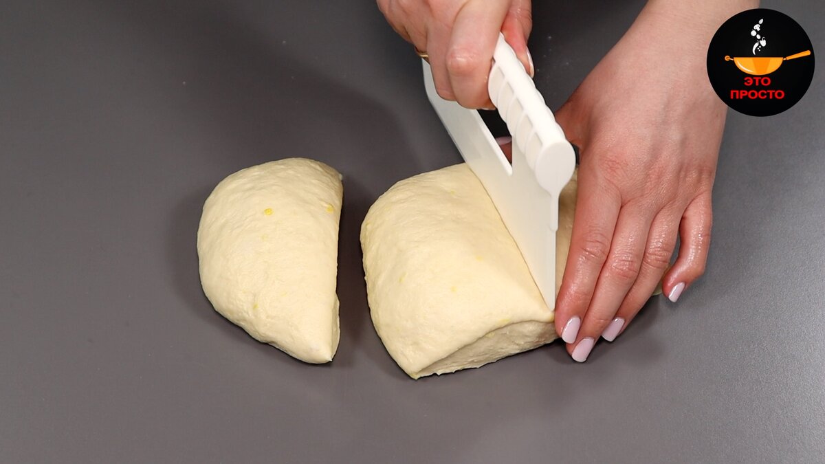 Спустя час тесто хорошо поднялось, оно увеличилось в объёме, стало очень воздушным, пористым. Теперь его хорошенько обминаем и разделяем на 3 одинаковых по размеру кусочка. Если взвесить, то каждый будет по 350 г.