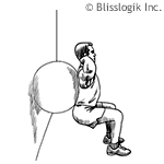 Исходное положение (ИП): встаньте спиной к стене, прижав к ней гимнастический мяч. Ноги поставьте слегка вперед и на ширину плеч. Поясница плотно прижата к мячу.