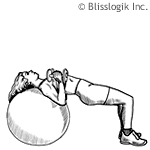 ИП: лягте спиной на мяч, он должен оказаться под поясницей. Ступни прочно стоят на полу на ширине плеч. Колени согнуты под прямым углом. Прогнитесь в пояснице (растягивая пресс), чтобы плечи оказались ниже грудных. Руки на затылке, но кисти не сцеплены в замок. Локти разведены.