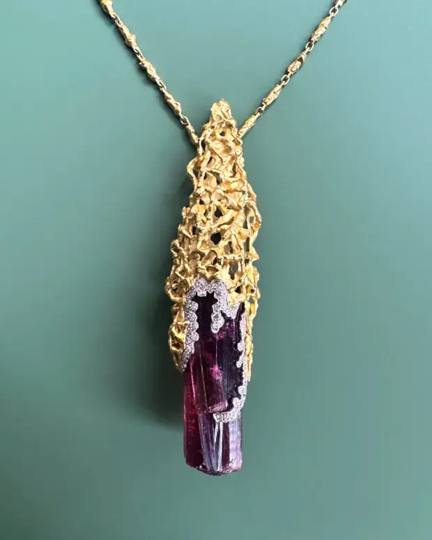 Кулон с золотом, розовым турмалином, изумрудом и бриллиантом от Andrew Grima, 1968