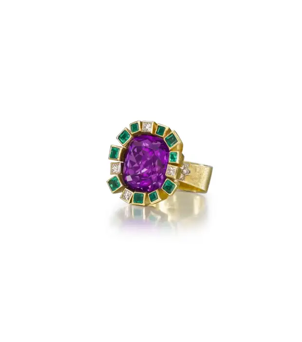 Кольцо из 18-каратного золота, аметиста, изумруда и бриллианта от Andrew Grima, 1995