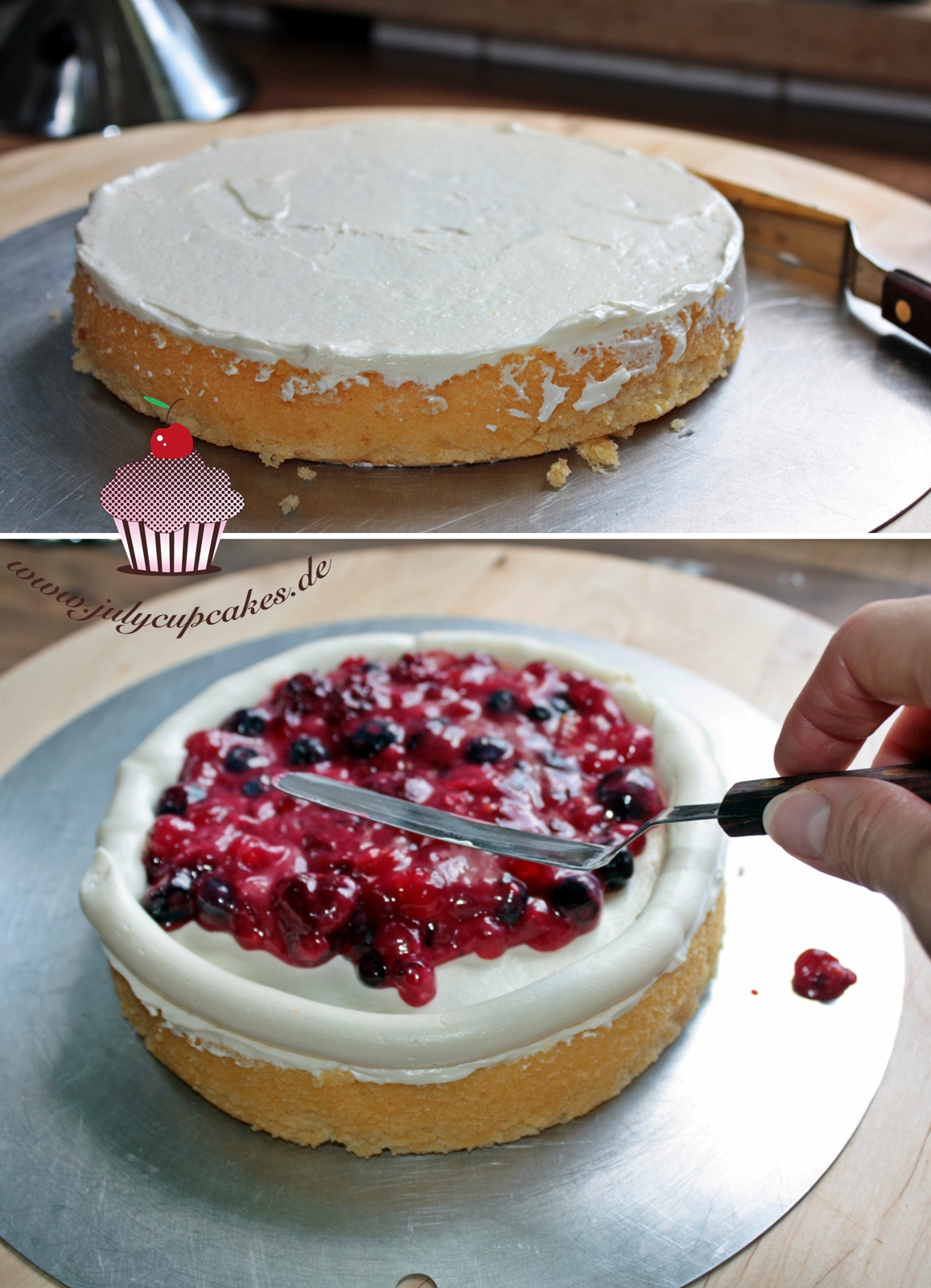 [462x640]Срезаем угол у целлофанового пакета с кремом. Выдавливаем дамбу по краю коржа. Затем аккуратно заполняем ягодной начинкой, кладём на него следующий корж и повторяем с дамбой из крема и ягодной начинкой. Кремовая дамба нужна для того, чтоб начинка не вытекла наружу и торт сохранял свою форму.