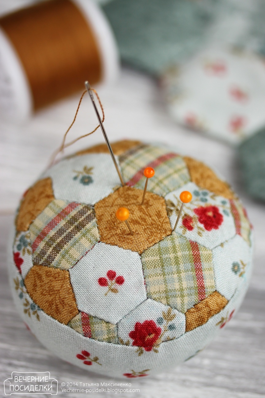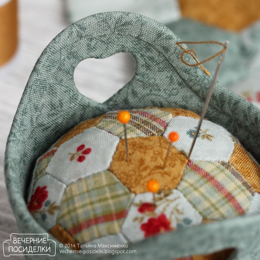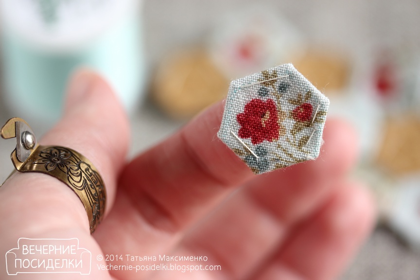 Верх подушечки сшит вручную из крошечных шестиугольников, как раз умещающихся на кончике пальца (на «кольцо всевластия» слева внимания не обращайте, просто в кадр попало). :-)