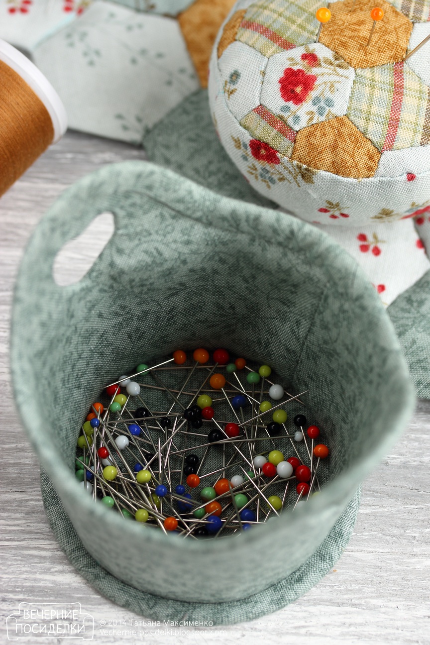 Кадочка работает игольницей и состоит из двух частей: корзинки и подушечки. Корзинка круглая, сужается книзу. Продублирована Decovil-ом. Из-за жёсткости, так же как и на предыдущей корзинке, бейку и сверху, и снизу пришлось пришивать вручную. Под машинку подсунуть, наверное, можно было, да жалко материал, вдруг деформировался бы. Да и при таком размере ручное пришивание совсем не проблема: диаметр корзинки в верхней части всего 7,5см, а высота (вместе с ручками) 7см.