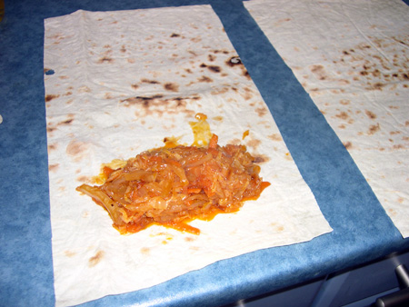 На край лаваша положить начинку. Завернуть лаваш конвертиком, подгибая бока вовнутрь.