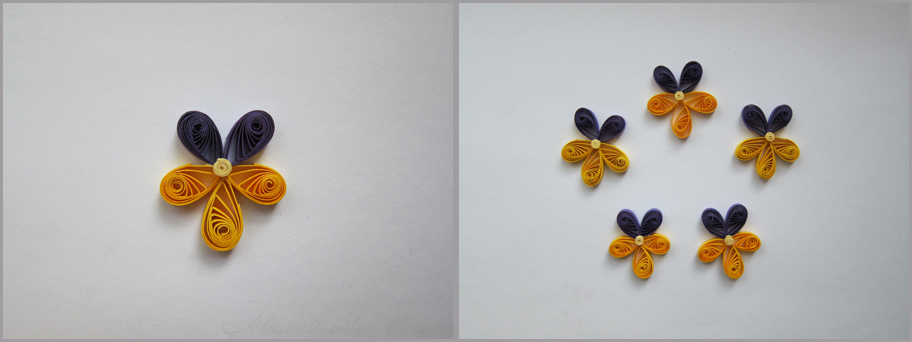 Получили два склеенных фиолетовых лепестка, делаем то же самое с желтыми, а затем полностью склеиваем цветок:
