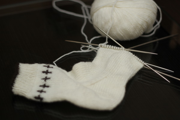Отдельно несколько слов о дизайне: как обычно, решались исключительно практичные цели. Во-первых, дети в светлых носочках - это очень мило. Во-вторых, у меня большой запас белого «детского каприза», и чтобы как-то отличать парность при стирке, выбран очень простой рисунок и простейшая отделка по верхнему краю.