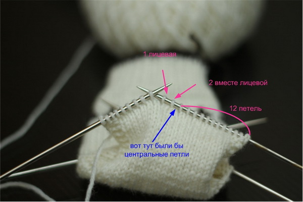 Приступаем к формированию мыска (т.е. самого кончика носочка). Для этого по бокам носочка будем делать симметричные убавления петель: