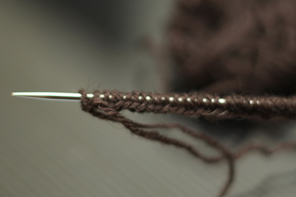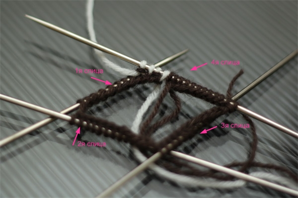 ... и распределяем петли между 4 спицами; по 12 петель на каждой. Складываем спицы «квадратиком», четвертой спицей (по ходу вступления в работу) провязываем первые четыре петли первой спицы (это делается во избежание образования отверстия в месте перехода. Во втором-третьем ряду эти петли нужно будет обратно вернуть на первую спицу). Так замкнулся круг. На фото эти первые 4 петли провязаны белой нитью.