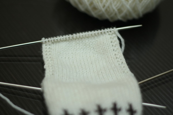 После 5-го ряда рисунка вяжем по кругу белой нитью еще 4 см (20 рядов).