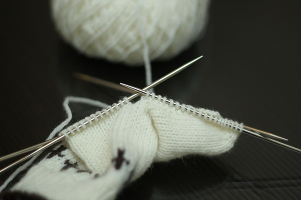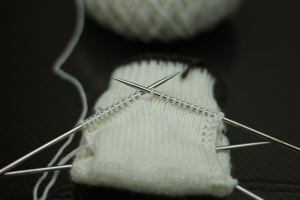 Провязываем 8 петель первой спицы и начинаем поднимать боковые петли из стенки пятки, поднимая по одной петле из каждого рубчика: