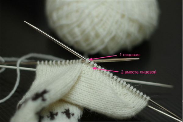 - на второй спице: вяжем 1 лицевую, 2 вместе лицевой с наклоном влево, 6 лицевых;
