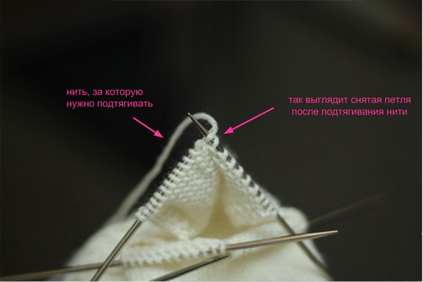 Поворачиваем вязание. Перед нами снова лицевая сторона. Снимаем одну петлю, подтянув нить (см.выше), вяжем 3 лицевых, затем 2 вместе лицевой, 1 лицевую: