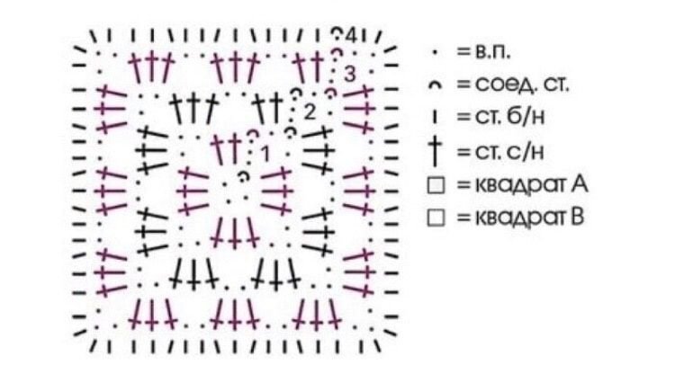 Квадрат А. Крючком № 4,5 выполнить цепочку из 4 возд. п. и с помощью 1 соед. ст. замкнуть уу в кольцо. Продолжить работу согл. схеме круговыми рядами. Каждый круговой ряд начинать с возд. п. подъёма, как показано на схеме, и заканчивать 1 соед. ст. в последнюю возд. п. подъёма кругового ряда. С 1-го по 4-й круг. ряд связать 1 раз, при этом цвета для 1-3-го круг. р. выбрать по собственному усмотрению, 4-й круг. р. постоянно вязать темно-серебристой нитью.