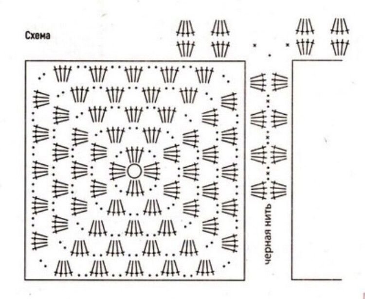 Мотив "бабушкин квадрат": вяжите по схеме, меняя цвет нити в каждом ряду. Обвязку каждого мотива выполняйте пряжей черного цвета, мотивы соединяйте между собой в процессе обвязки.