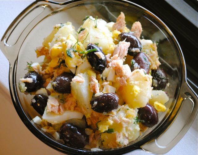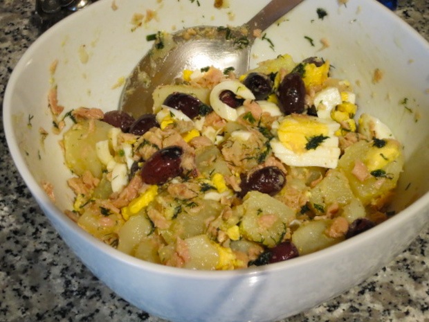 Предлагаю вам очень простой, быстрый, но тем не менее милый и душевный салат, который хорошо идет на обед. Это картофельный салат с консервированным тунцом, яйцом, оливками и укропом, заправленный оливковым маслом. Все ингредиенты очень хорошо сочетаются, а оливки удачно оттеняют вкус картофеля.