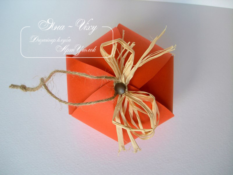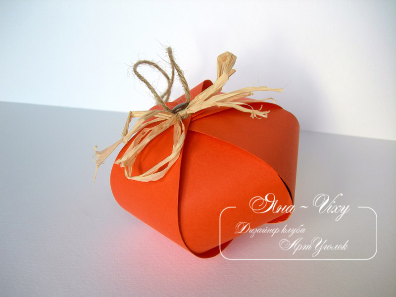 Шаг 4. Крафт бумагу помните и заверните в неё конфеты (яйцо). Положите конфеты в тыковку, разогните ножки брадса и закройте отверстие оставшимися двумя лепестками. Будте готовы к тому, что может не сразу получится. Лепестки могут постоянно соскакивать с брадса. С конфетками внутри, гораздо сложнее надеть лепестки на брадс. Но в конце концов у вас получится.