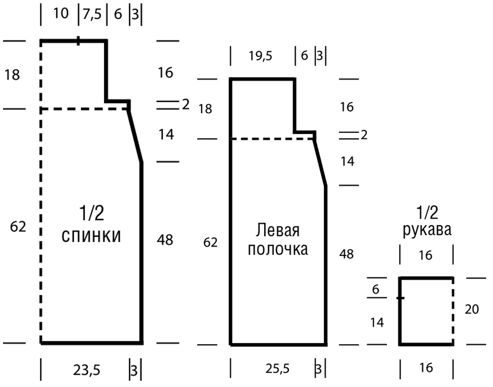 Через 2 см = 4 ряда от конца последовательности узоров закрыть для проймы по правому краю 1 x 10 п. = 32 п. На высоте спинки закрыть все петли.