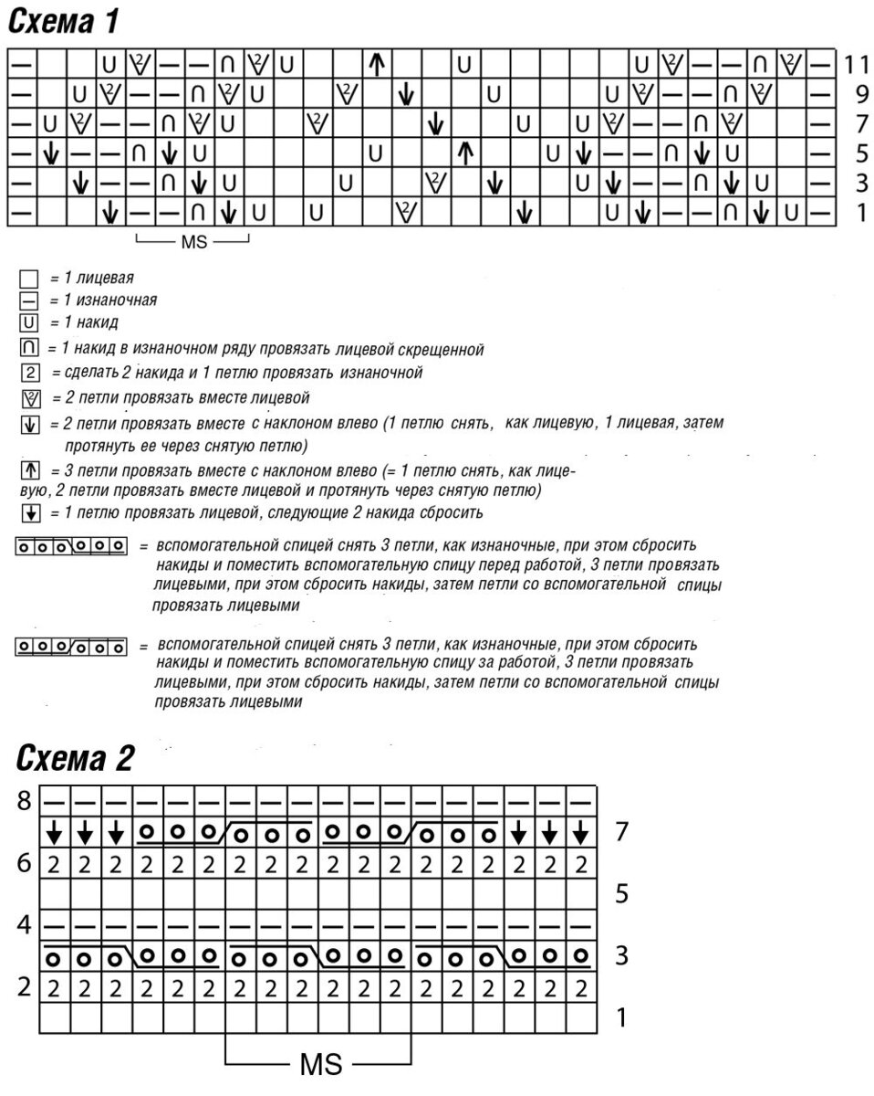 Число петель кратно 6+2 кром. (вязать согл. схеме 2)