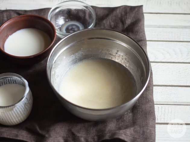 Отдельно взбейте молоко и кефир с сахаром и растопленным, но слегка охлаждённым сливочным маслом. Когда сахарные кристаллы растворятся, влейте жидкость в сухие ингредиенты.