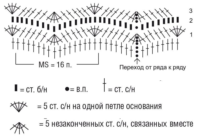 Вязать крючком №4 по приведенной схеме. Сначала выполнить с 1-го по 3-й ряды, затем повторять 2-й и 3-й ряды.